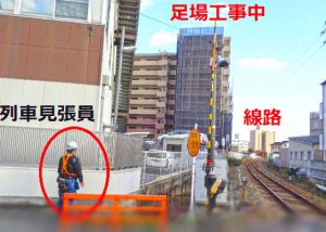 一例ですが、仮設足場の組立と解体の際には、線路際に「列車見張員」を配置しないといけません。