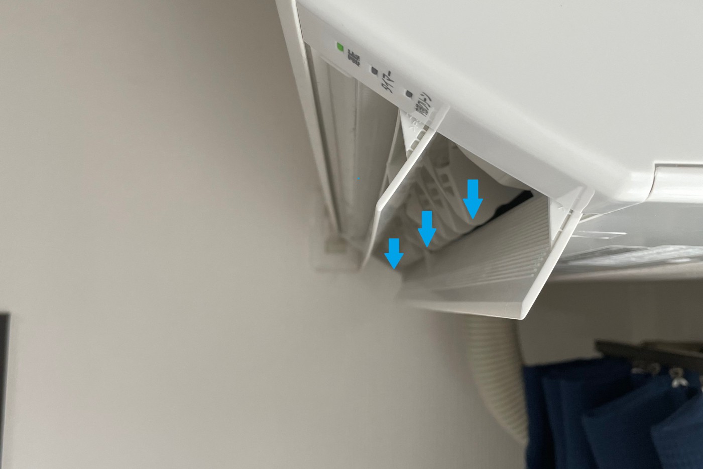 ①-2ドレンホースに詰まっているゴミが無いか確認してみてください。ドレンホースに詰まったゴミは、割りばしや使い古した歯ブラシなどで取り除いて下さい