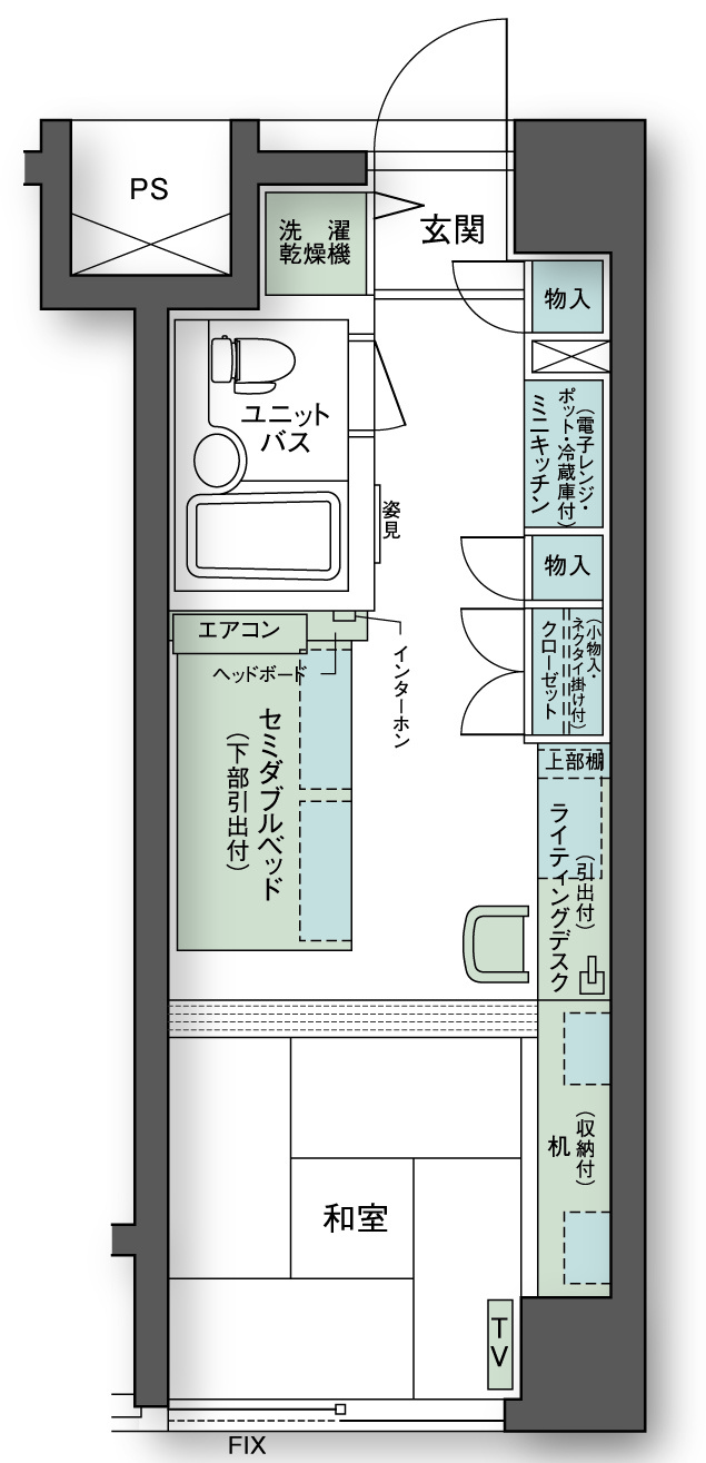 ・テレビ、ベッド、テーブル、洗濯乾燥機、冷蔵庫、電子レンジ、電気ケトル、エアコン等
