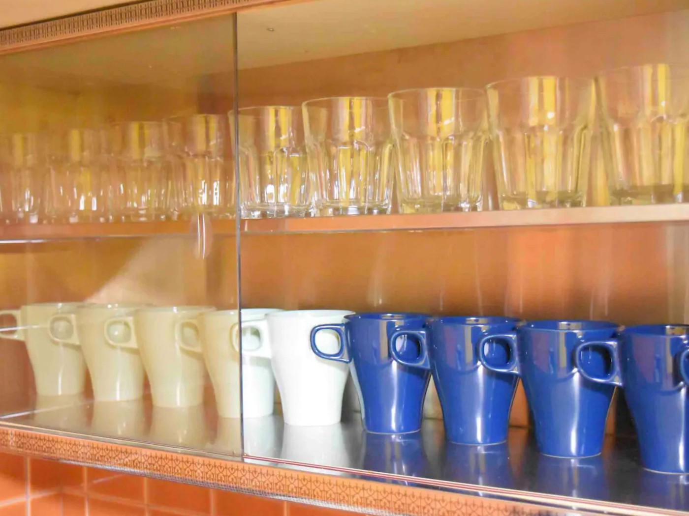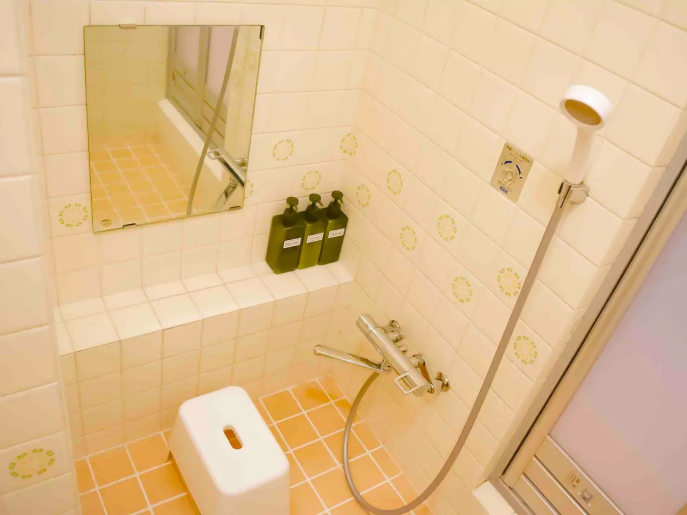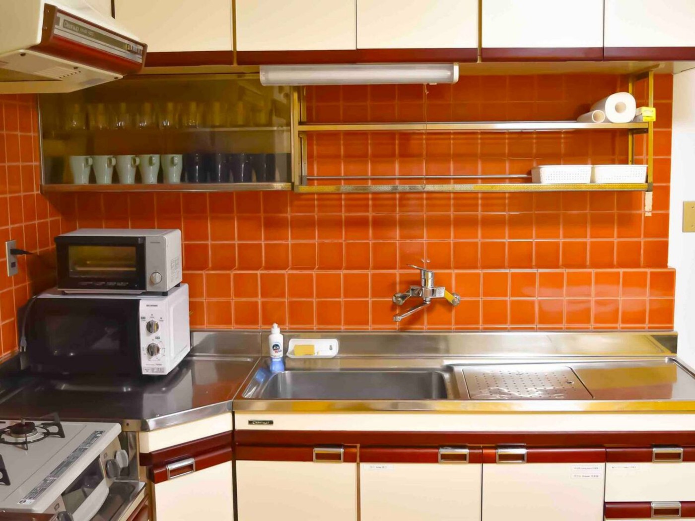 少しレトロなタイルがかわいいキッチンには電子レンジはもちろん、炊飯器、ケトル、トースターなど簡単な調理器具が揃っています。