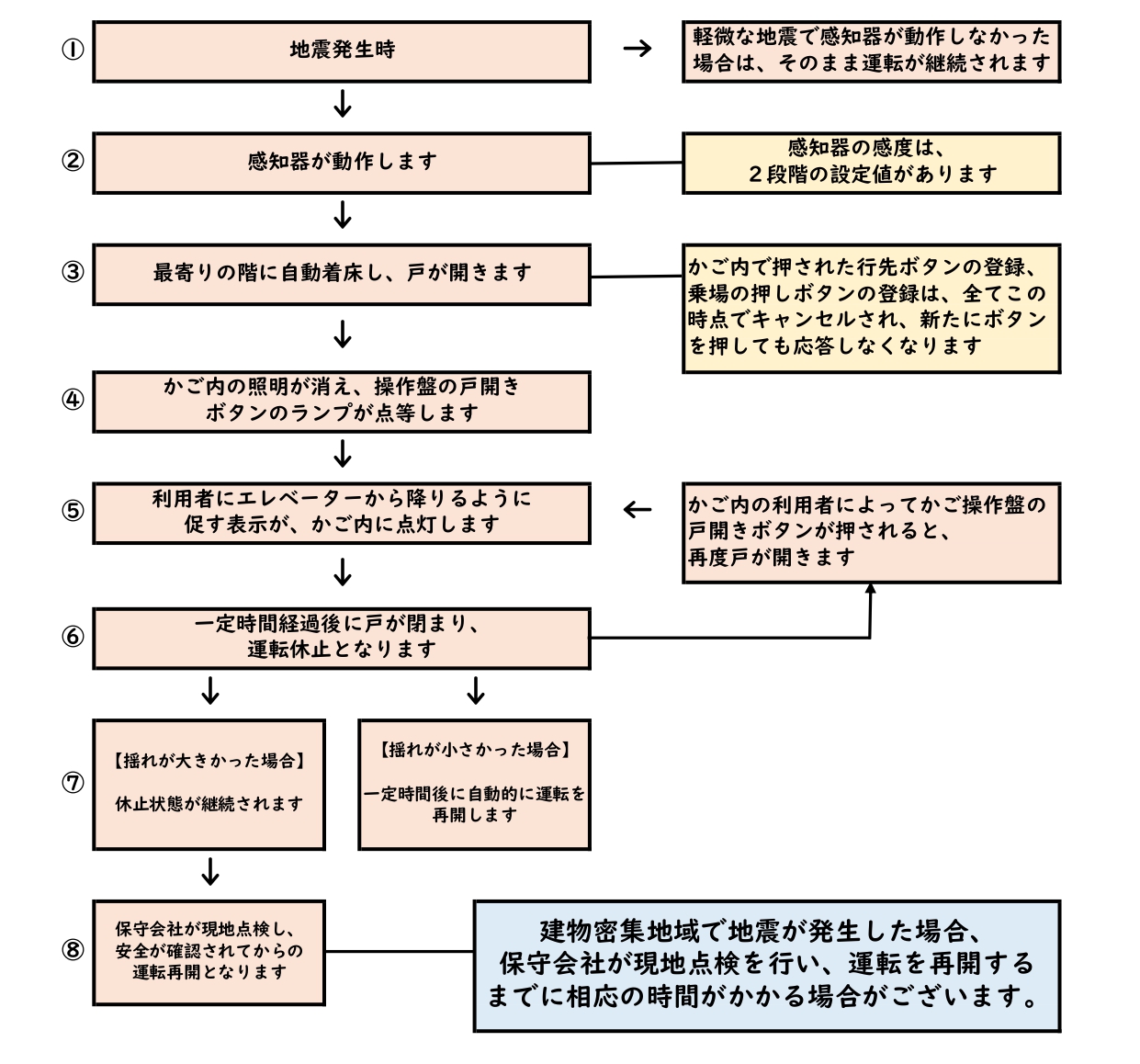地震感知器が感知する地震の大きさには、『特低』と『低』の設定があり、地震感知器が動作すると走行中のエレベーターを最寄り階に停止させ、ドアを開けて乗客を避難させます。