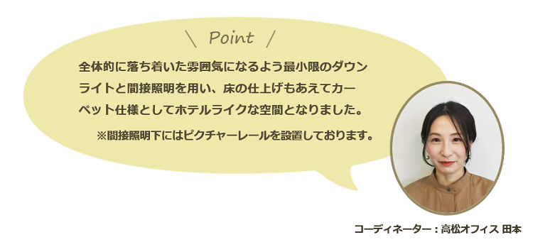 全体的に落ち着いた雰囲気になるよう、最小限のダウンライトと間接照明を用いました。