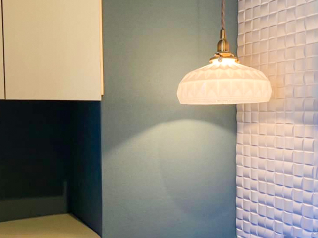 トイレの奥隅に設置したペンダントライトのガラスシェードは、