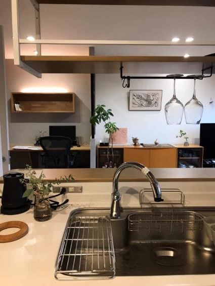 造作のオープン収納と、カウンターを設けたワークスペースを確保しました。