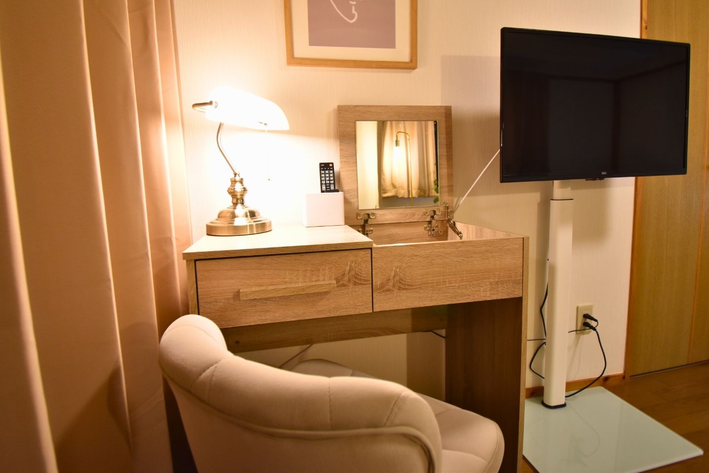 ・ワークデスクあり。収納された鏡を出してドレッサーとの2WAY可能