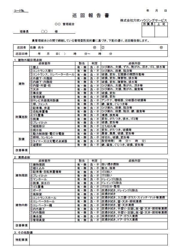 以上の点検を『巡回報告書』に記入しながら行い、取りまとめたものをお客様に提出します。