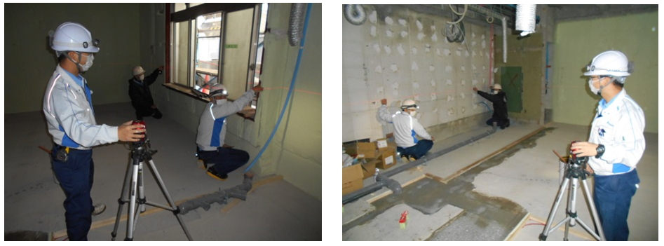 外壁の内側には発泡ウレタンフォームを吹き付け、断熱加工を行っております。その後、室内の壁天井を組み立てていくために高さのレベル出しを行います。現場監督員達により赤外線レーザーを使い壁の下地へ基準墨を出している状況がこのような感じです。