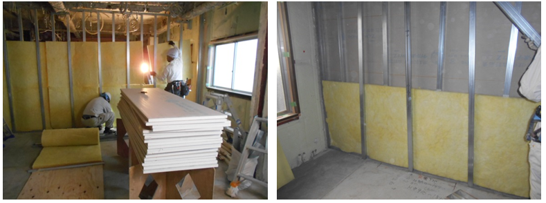 お部屋の間仕切り壁内側には吸音材を敷き詰め遮音性の確保をいたします。