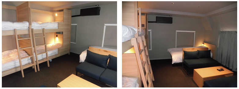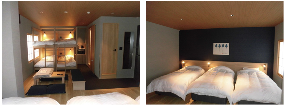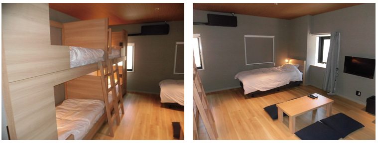 2つの部屋を一度解体し、再構築して一つにすることで、ベッド数を増加させることで利用者数を多く設定することが可能となりました。床材・天井材の色合いを変えることで雰囲気が変わります。家具の取付を行いましたが、これもまた、雰囲気が変わって宿泊の楽しみ方がいろいろご提案できそうです。