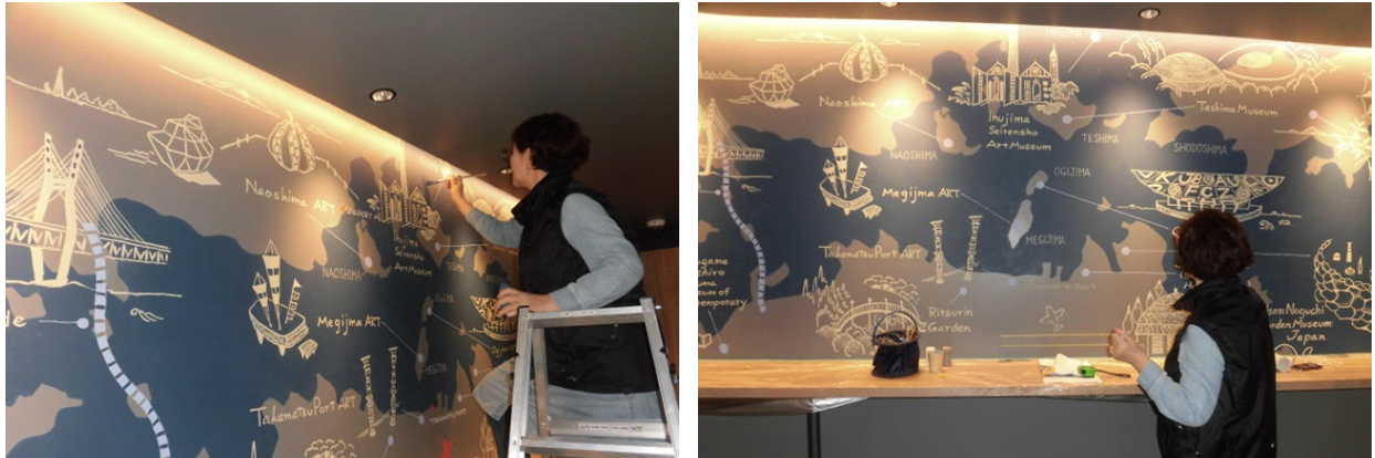 こちらは、作画状況です。東京から先生が香川県・瀬戸内を壁画していただきました。先生、ありがとうございました。