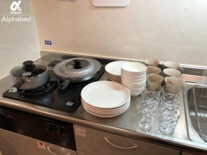 各お部屋、キッチンには鍋、フライパン、フライ返し、トング、包丁、まな板、簡単な食器類 (スプーン、フォーク、箸、皿、コップ) もご用意していますよ。