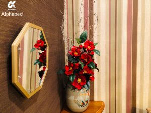 こちらのお部屋のコンセプトはマドンナ。茶色×紅色の組み合わせがどこかレトロさを漂わせています。室内には松山のシンボルである椿や浴衣の帯を利用した装飾など、こだわりが沢山詰まっていますよ。