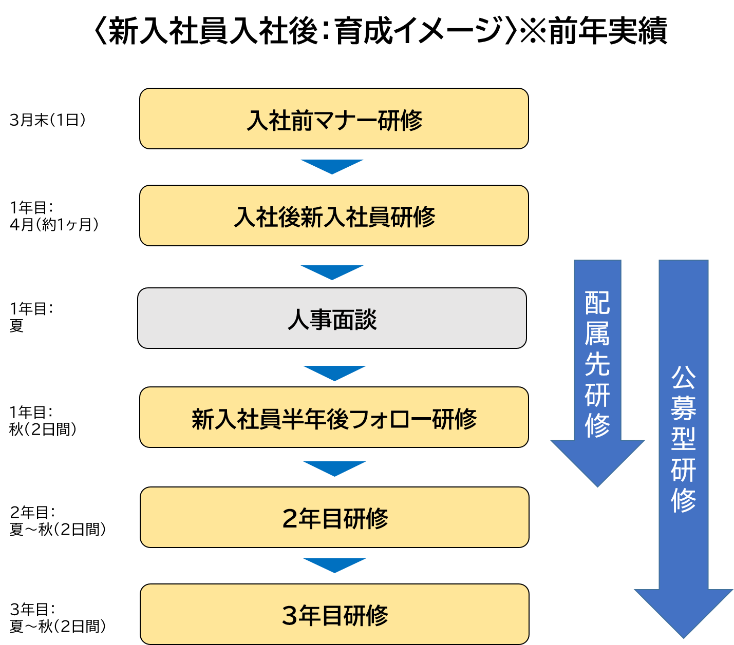 新入社員研修はもちろんのこと、その後も入社半年後・2年目・3年目と節目で研修が実施されます。