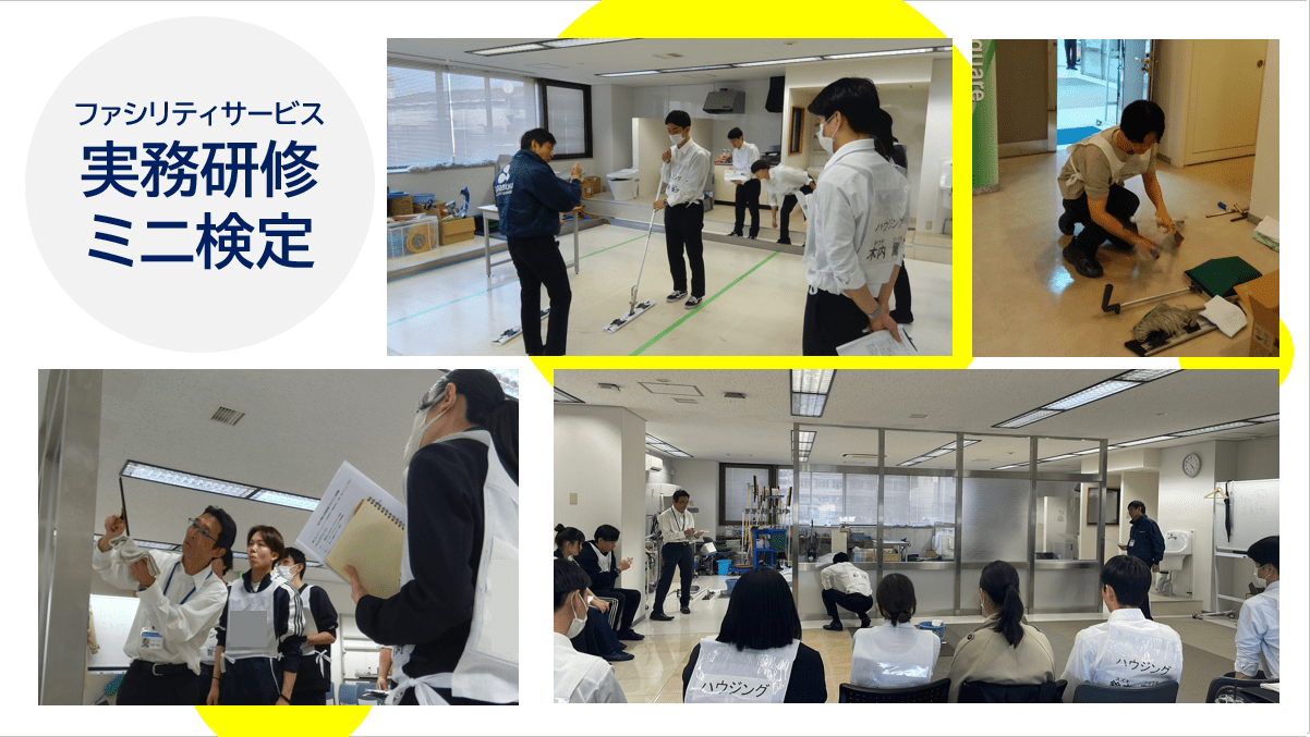 ファシリティグループ社員は入社後、国家資格”ビルメンテナンス主任者”の実技内容+ファシリティグループが大切にしているCS(顧客満足)を体現できているかのシビアな社内検定を実施しています。
