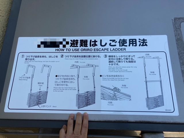 避難器具には一部を除き、使用方法の説明板がありますので、壁等に掲示してある場合は物品等で隠すことの無いようにしておきましょう。また、設置されているお部屋の方は使用方法をご一読いただき、有事の際は使用できるようにしましょう。