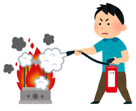 初期消火とは、火が床等、横に広がっているだけの間、あるいはカーテンふすまなどの立ち上がり材に火が移ったときまでに火を消すことを言います。