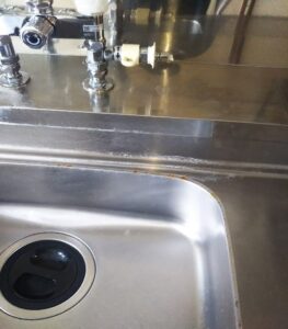 台所は日常的に使用する場所ですので、日頃より頻繁にお手入れをし、衛生的でありたいですよね。ただし、きちんと上手くお手入れがされていないと、ステンレスに下部のような、錆や水垢が発生しています。錆を落とす方法は調べると色々ありますが、私は水に溶かしたクエン酸水を、錆にふりかけた重曹の上にスプレーして少し時間を置き、炭酸を発生させて 錆を浮き上がらせてから、メラニンスポンジで擦ることで錆を落とすことができました。硬いたわしや、硬いブラシを使用するとステンレスを傷つけてしまうので、使用しないようにしましょう。
