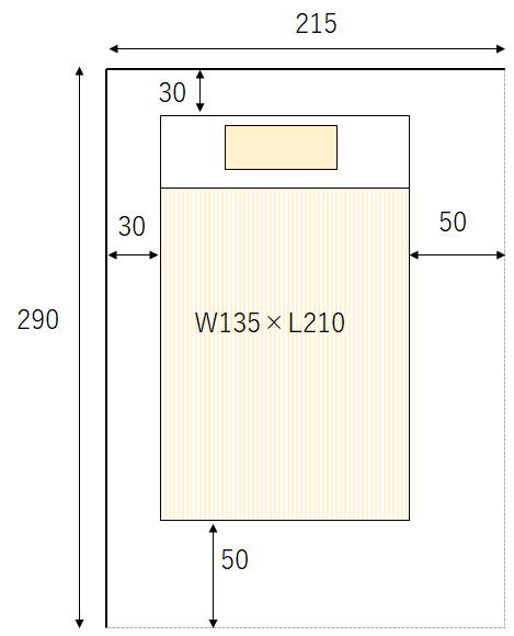 ベッドではなくお布団派の方の場合、1人用のサイズ感は幅135cm縦210cmです。