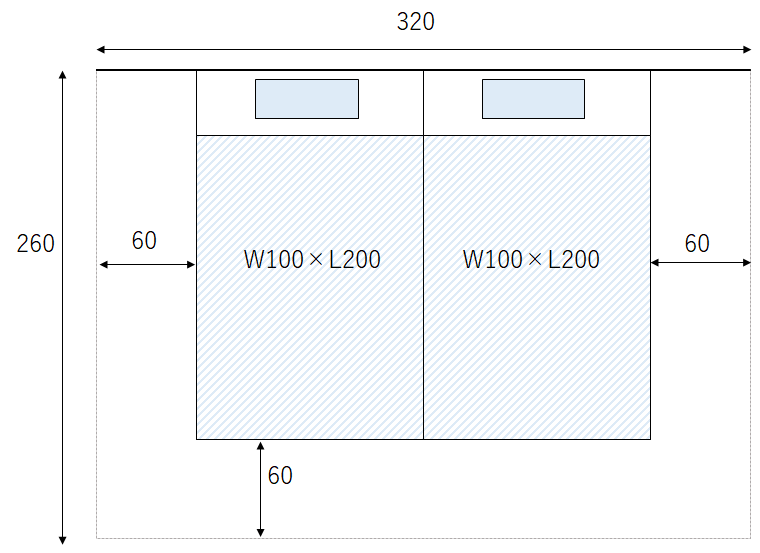 また、シングルベッドを2つ並べてみるとベッドだけで幅200cm縦200cm。