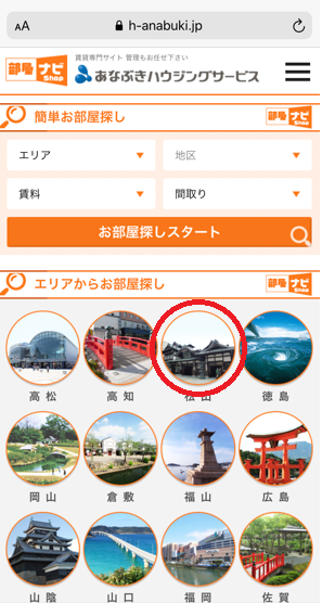 1.部屋ナビshopトップ画面で希望エリアを選択
