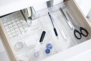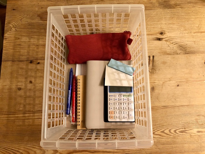 「お仕事BOX」を作り、その中に仕事で使う文房具やPC廻りの小物等を入れ、仕事で使うものは一箇所にまとめて管理するのがオススメです。