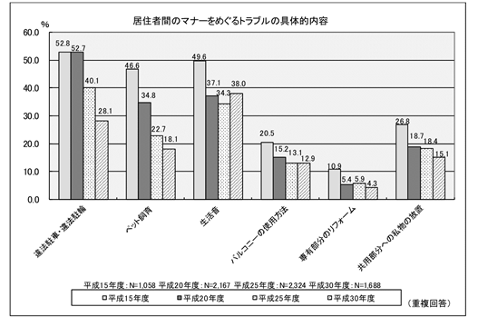 また、国土交通省の「マンション総合調査」ではトラブルについて、『話し合いによる解決』が一般的で、平成15年の調査では約80%が住民同士の話し合いで解決されたと報告されています。