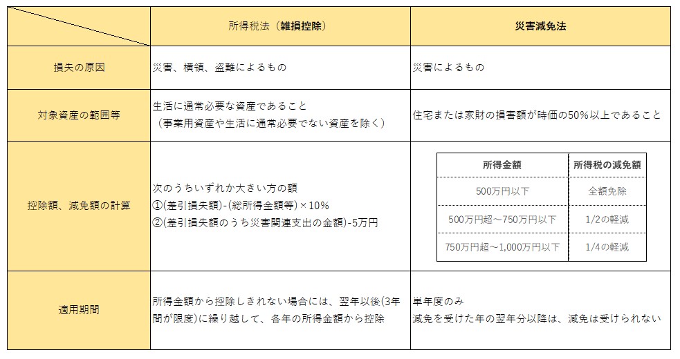 所得税法の「雑損控除」は災害以外でも利用できるのに対し、「災害減免法」は名前の通り地震や風水害などの災害のみに利用できる制度です。