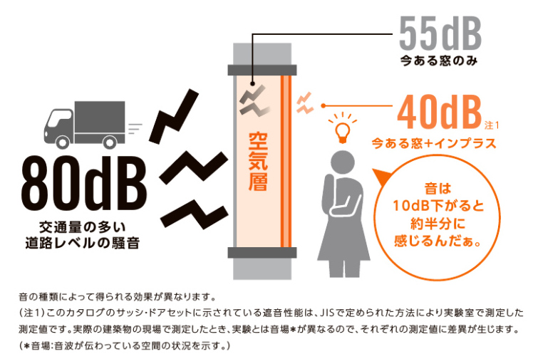 人間の耳は、音の大きさが10dB下がると音が半減したように感じると言われ、快適で静かな環境づくりにも効果的です。