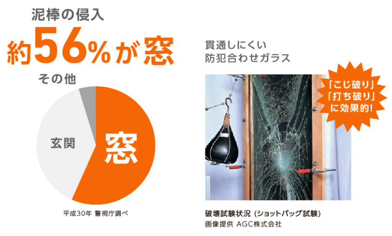 さらに特殊な中間膜を2枚のガラスの間に挟んでいる「防犯合わせガラス」は耐貫通性に優れ、「こじ破り」や「打ち破り」対策にも有効です。