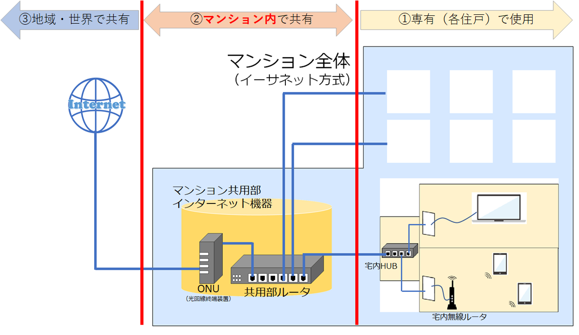 全戸一括契約の場合、インターネットの回線をマンション内で共有しています。