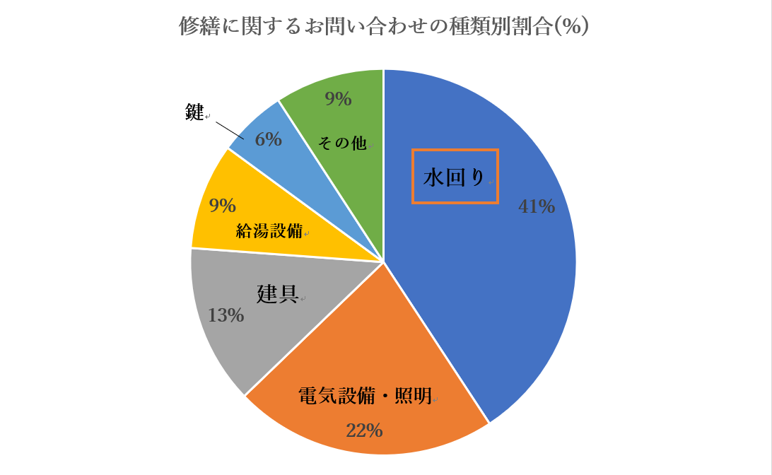 お問い合わせの中でも、「浴室シャワーから水が止まらなくなった!」、「キッチンの排水管から水漏れしている…」というような水回り設備の不具合に関する修理のご相談をたくさんいただきます。