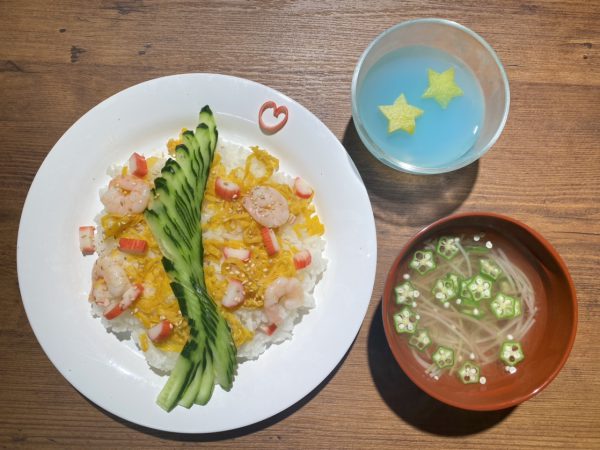 今回は天の川をイメージしたちらし寿司とそうめんとおくらが入ったすまし汁、学校の給食でもおなじみの七夕ゼリーを作ってみましたので、一部ご紹介します。