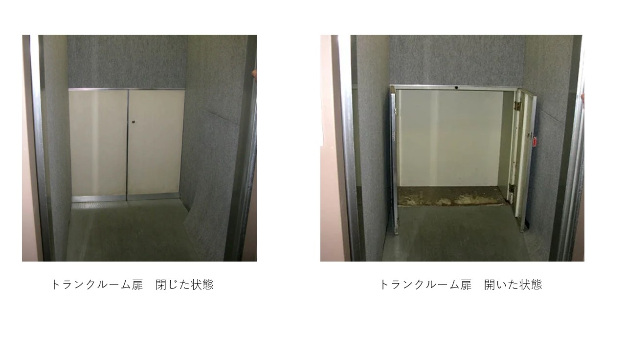 「エレベーター内トランクルーム」の扉は、お子様がかくれんぼ等の遊びによる事故を防ぐ目的で、常時鍵が掛けられています。この扉の鍵は、管理人室や警備会社で管理されているのが一般的ですが、法改正により平成15年以降に設置された扉は、全国で統一規格の鍵を救急隊員さんが所持しており、万一の場合においても敏速な扉の開放が可能となっています。尚、統一された規格の鍵で開けることが可能なエレベーターには「E.M.T.R」の刻印が鍵穴に成されています。(※E.M.T.R=Emergency  medical Trunku Roomの略)