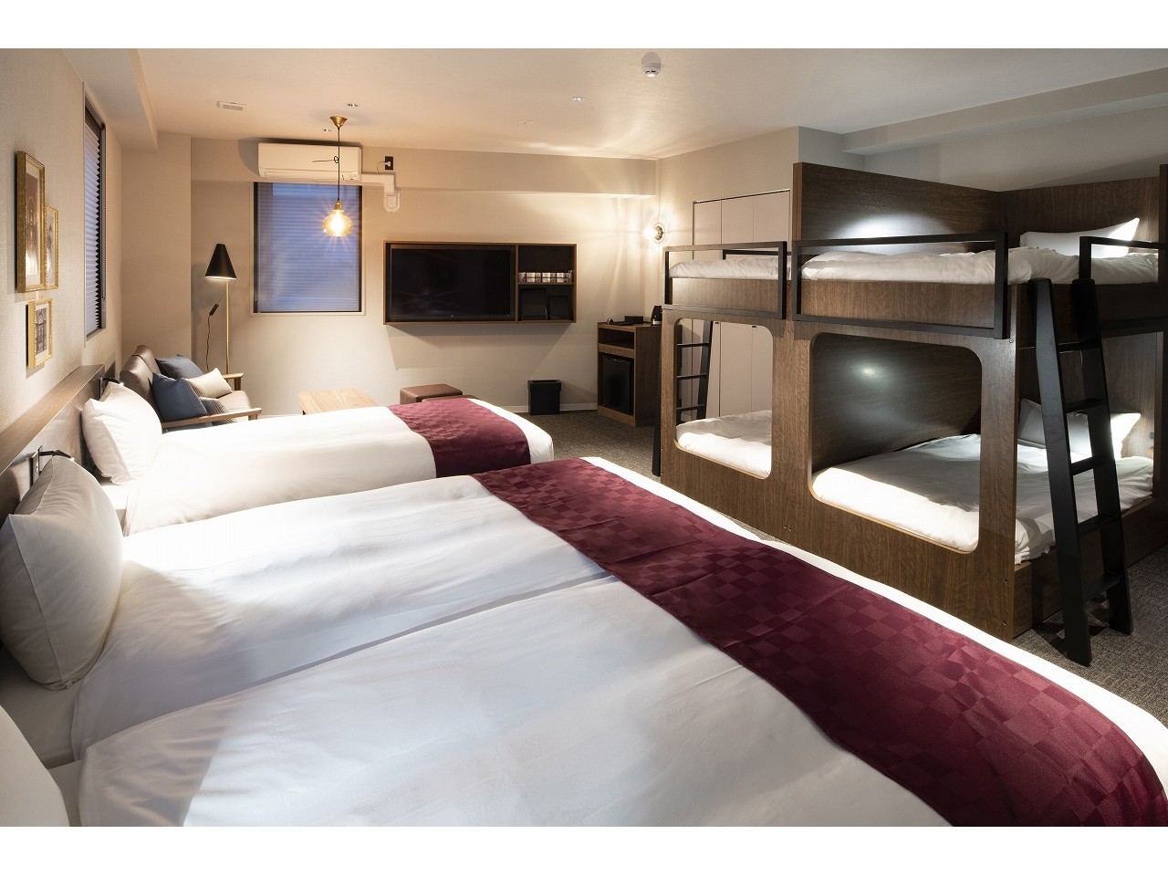 西陣織などをインテリアのモチーフにしている和モダンなコンパクトホテルで、お部屋は隣り合うことがないので気兼ねなくご利用いただけます。