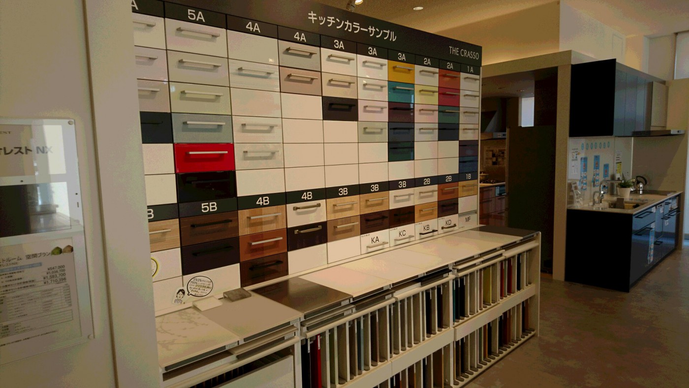 キッチンの色選びのスペースです。カタログではわかりづらい色味を全種類チェックできます。