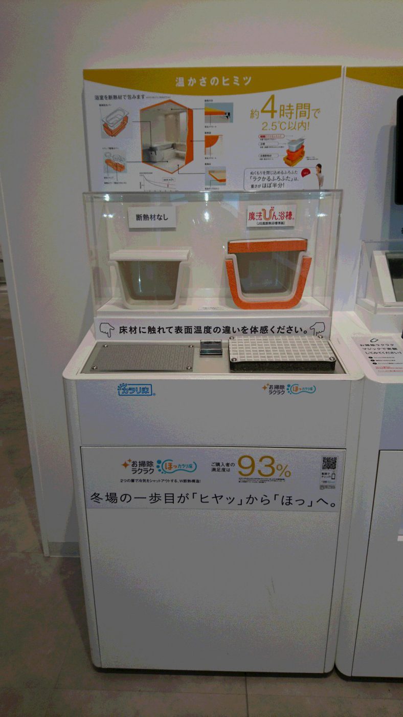 魔法びん浴槽の仕組みや、温かみがあり、水はけもよい「ほっカラリ床」の体感ブース。