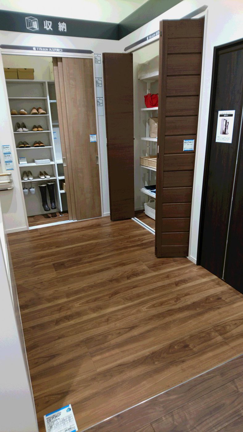TDYのDにあたるDAIKENの展示ブースです。フローリングやドアなんかもたくさん展示があります。
