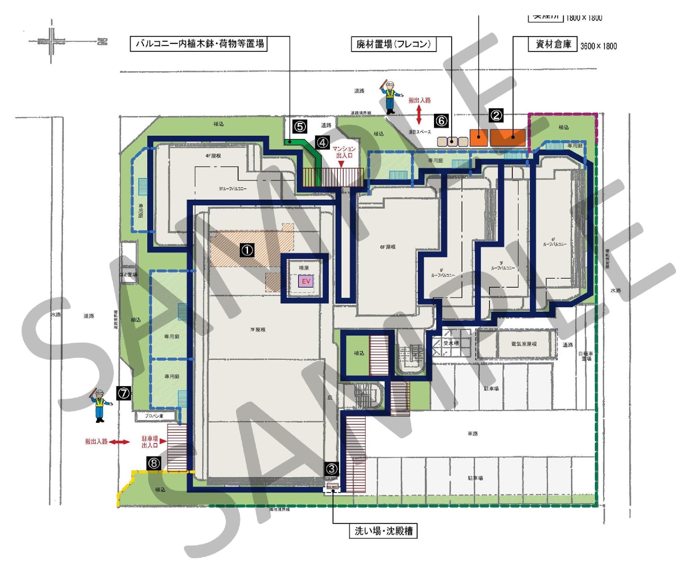 仮設計画図とは、建物内のどこに足場を仮設し、事務所、作業員休憩所、水栓関係をどこに配置するかを明記したものになります。各業者様々な計画図があるかと思いますが、精査するうえで重要なポイントは、「安全対策がどれだけとられているか」、「居住者の生活をどれだけ考慮されているか」になります。マンションの大規模修繕工事は住人が生活しながらの工事になるため、日常生活になるべく影響が少ない仮設を選定することが重要になります。