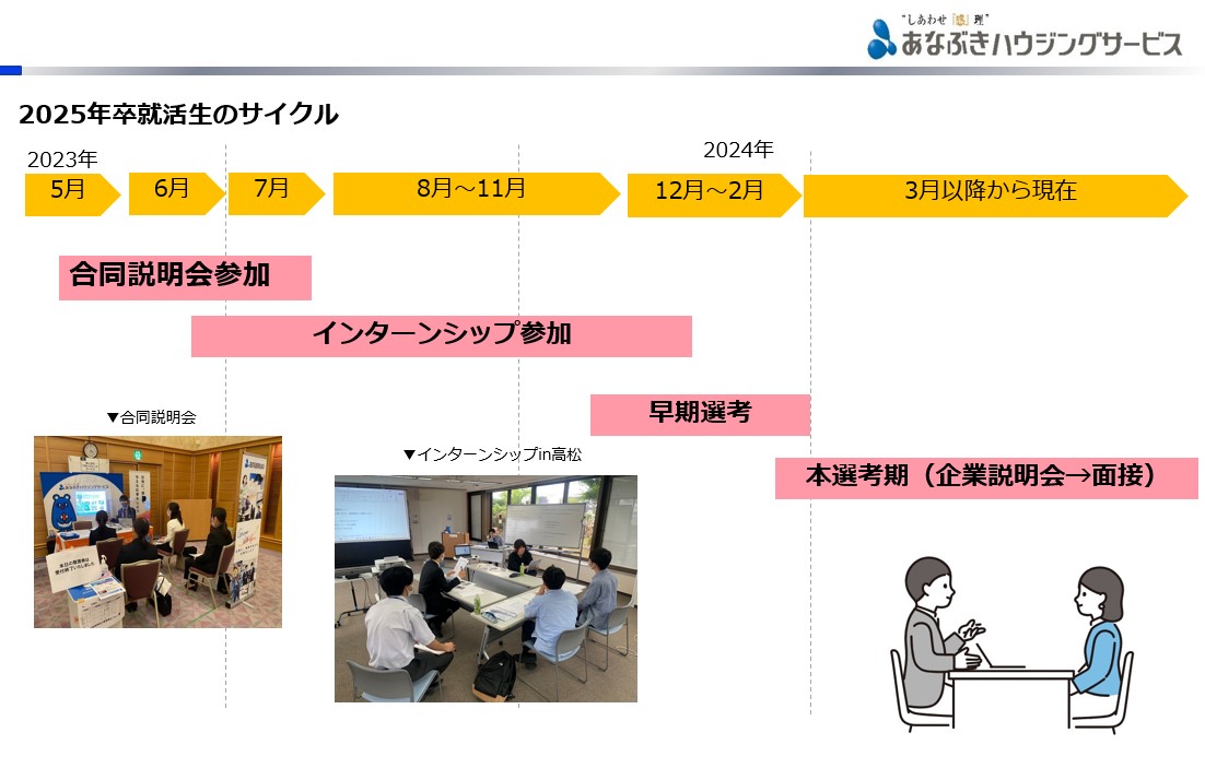 2023年春夏の合同説明会を皮切りに、夏秋でインターン、秋冬で早期選考、2024年春の本選考と進んでいきます。