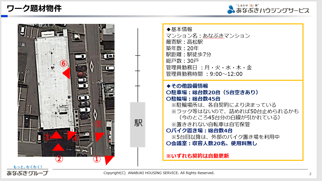 弊社の基幹事業の一つである、分譲マンションの管理について、グループワークを通じて問題解決を目指す、就業体験となっております。マンション管理と聞いて、中々イメージが湧かない方もいらっしゃるのでは?弊社のインターンシップでは、架空の穴吹マンションという建物を舞台に、そこに住んでいるお客様のニーズに「気づく」、気が付いたニーズに対して解決策をチームで考える、そして解決策を「伝え」「実現する」というステップでグループワークを進めていきます。グループワークの最後には、人事担当者から一人一人にフィードバックがあることもポイントです。良かった点だけでなく、必ずmoreポイントまで共有させていただいております。