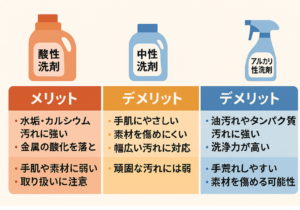 同じ“汚れ落とし”でも、洗剤の性質が合っていなければ汚れが落ちないどころか、素材を傷