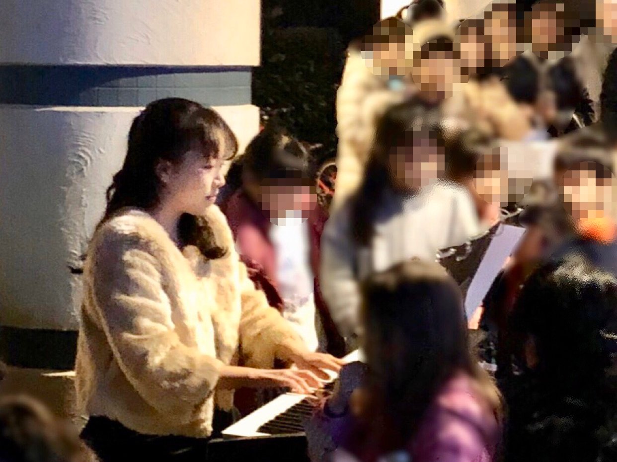 同時に吉田奈生さんによるピアノ演奏が行われてイルミネーションとの美しいコラボレーションが実現しました。ディズニーの曲など十数曲が演奏されて、参加されたお子様は一緒に歌ったり、ピアノ演奏の様子を間近で観たりして楽しいひとときを過ごしておりました。