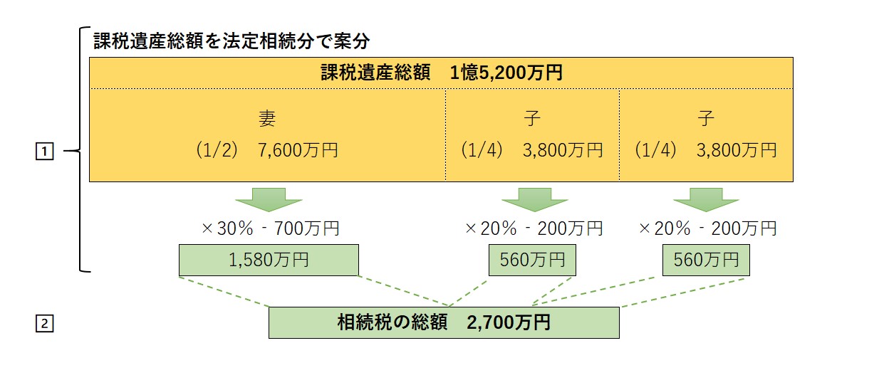 1.課税遺産総額を法定相続分どおりに取得したものと仮定して、それに税率を適用して各法定相続人別に税額を計算します。