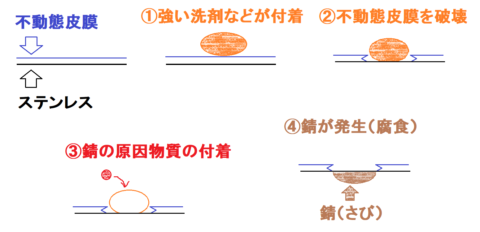 皮膜自体は瞬時に回復しようとしますが、破壊物質が接触したままだと回復するよりも早く破壊され、そこに錆の原因となるものが付着することで錆が発生してしまいます。