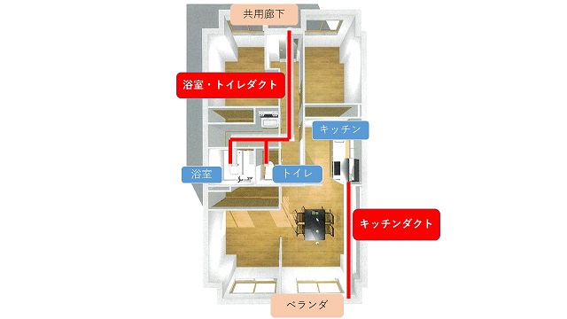 ダクトとは、キッチン・浴室・洗面・トイレの換気扇から外部(お部屋の外)に空気を出すための管の事を言います。