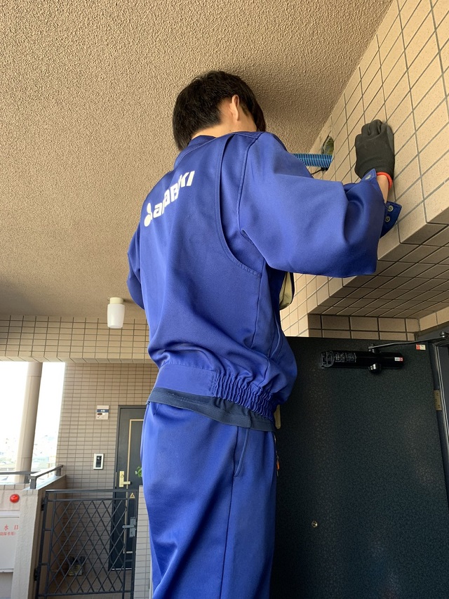 ※共用廊下側からダクト清掃作業中