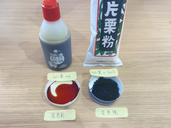 ヨウ素でんぷん反応とは小学校の理科でもおなじみの・・・褐色のヨウ素液が、デンプンと反応すると青紫色に変化するという反応です。ある身近なものを使ってこの反応を応用し、「手洗い」の実験をしてみます。