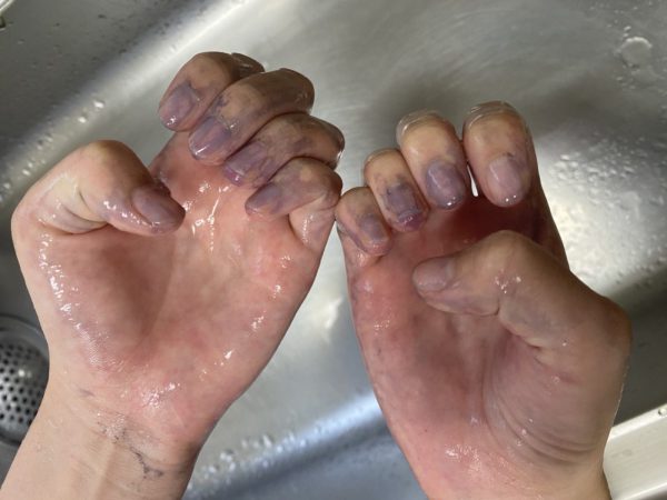 でんぷんクリームの洗い残しがあるとヨウ素液と反応し、このように色が付きます。