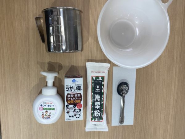 ② 大きめの容器に水、うがい薬を入れ混ぜる。(ヨウ素液)
