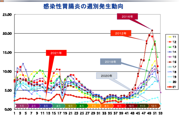 2020年(薄い水色)と2021年(赤色)のグラフは例年と比較して明らかに発生数が少ないことが分かります。2020年からは新型コロナウイルスにより手洗いうがいが習慣づけられていることもありノロウイルスを始めとする感染性胃腸炎の抑制にもつながっているのです。このグラフからも食中毒はご家庭でも実際に起こっている身近なものであり、「手洗い」が如何に大切かお分かりいただけたのではないでしょうか。